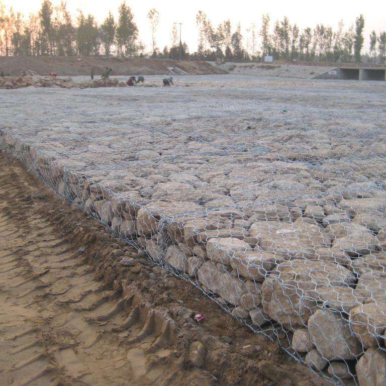 雷諾護墊是厚度在0.17-0.3m的網(wǎng)箱結(jié)構(gòu),在現(xiàn)場用于裝填石頭。主要用作河道、岸坡、路基邊坡防護結(jié)構(gòu)。既可防止河岸遭水流、風(fēng)浪侵襲而破壞,又實現(xiàn)了水體與坡下土體間的自然對流交換功能,達到生態(tài)平衡。坡上植綠可增添景觀、綠化效果。