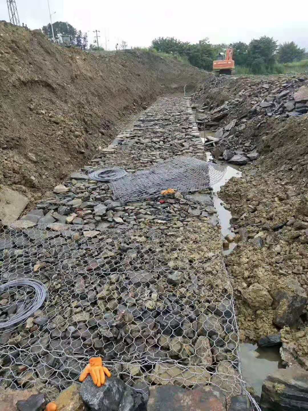 5.放置 綁好后,用機器小心將石籠網(wǎng)一個一個或兩個兩個的吊放到恰當位置。為了保證質(zhì)量,石籠網(wǎng)縫邊、組裝時應用較粗的邊絲和綁絲。