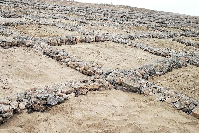 雷諾護墊箱是用鋼絲通過專用設備生產(chǎn)而成。在編織工藝中采用的是雙絞合六邊形金屬網(wǎng)格,因為采用了這種特殊的編織方式,單個網(wǎng)格在發(fā)生破損時,都不會引發(fā)相鄰的網(wǎng)格的破損。