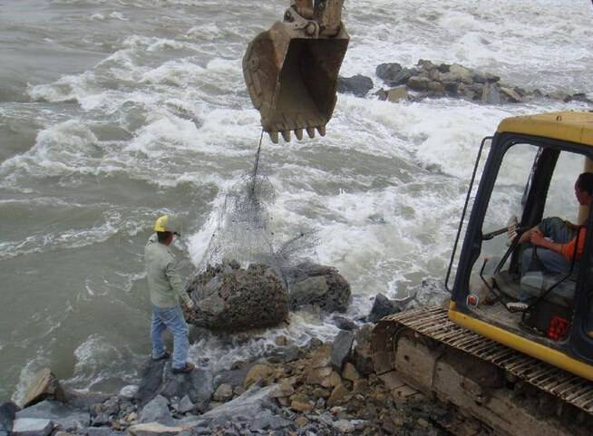 格賓網石籠防護技術是指由專用機械將涂塑或不涂塑(PVC樹脂)的熱鍍鋅鋁低碳鋼絲編織成格賓網片,然后將其裁 剪、拼裝成符合設計要求的格賓網箱籠,用塊石等填滿后用于堤防、河岸、路基的防護。格賓網石籠防護屬于柔性防護工程,有利于保護河道、堤防岸坡的安全穩(wěn) 定,可實現水土自然交換,增強水體自凈能力,同時又可以實現坡面植被綠化,使工程建筑與生態(tài)環(huán)境保護達到有機結合。