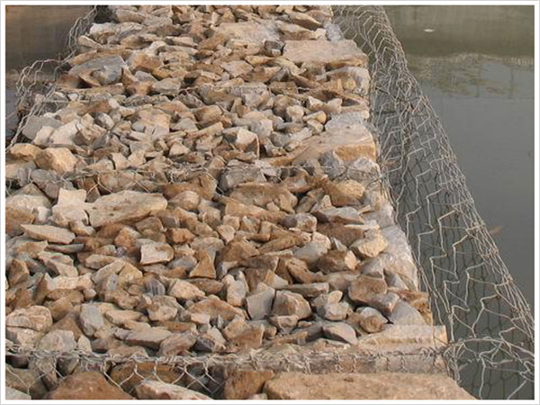 (3)將組長好的籠體安裝在所需的位置上,并與相鄰的籠體綁扎連接,將準備好的石塊或卵石填入籠中,要作適當?shù)拇a排,以達到較高的密實度,石塊直徑一般須大于網(wǎng)目的兩倍,石塊要選用抗風化能力強的石料。用拉筋來保持籠體形狀的規(guī)整,拉筋間距一般在300mm左右。