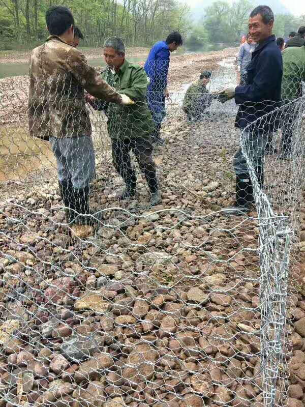 (3)將組長好的籠體安裝在所需的位置上,并與相鄰的籠體綁扎連接,將準(zhǔn)備好的石塊或卵石填入籠中,要作適當(dāng)?shù)拇a排,以達(dá)到較高的密實度,石塊直徑一般須大于網(wǎng)目的兩倍,石塊要選用抗風(fēng)化能力強(qiáng)的石料。用拉筋來保持籠體形狀的規(guī)整,拉筋間距一般在300mm左右。