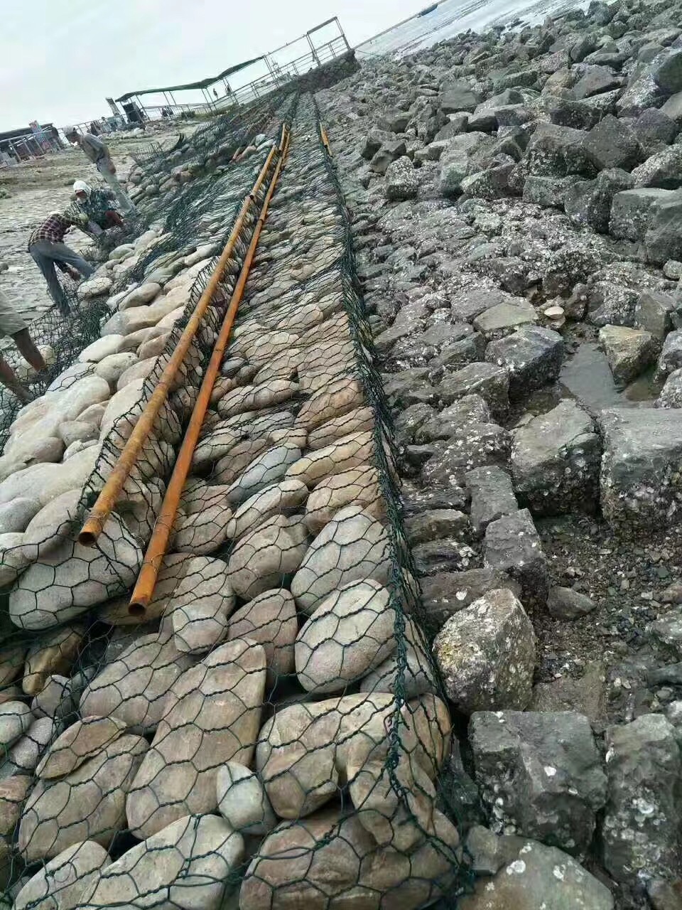 綠濱墊就是所謂的網(wǎng)墊,厚度在0.15-0.3m(含0.3m)的網(wǎng)箱結(jié)構(gòu),常見的厚0.17m,0.23m,0.3m,延伸率—抗拉強度都和固濱籠/格賓網(wǎng)是一樣的標(biāo)準,并且安裝也很方便。綠濱墊具有固堤防沖刷的作用, 固濱籠工藝是指將特種鋼絲由專用機械編織成雙絞、蜂巢形網(wǎng)目的格網(wǎng)片,根據(jù)工程設(shè)計要求,裁剪、設(shè)計、組裝成箱籠并裝入塊石等填充料后連接成一體的結(jié)構(gòu),用作提防、路基防護工程。