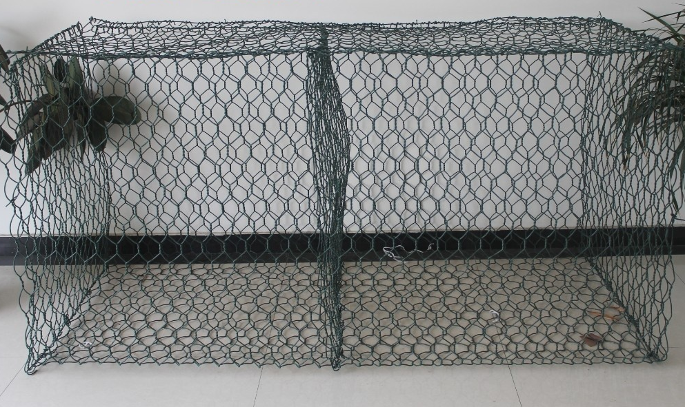 石籠網(wǎng)箱一般由4片重型六角網(wǎng)折疊組裝成的網(wǎng)箱,一片大的六角網(wǎng)折疊成長方體的4個(gè)大面,兩頭有兩小片的六角網(wǎng),中間有隔板網(wǎng)片。